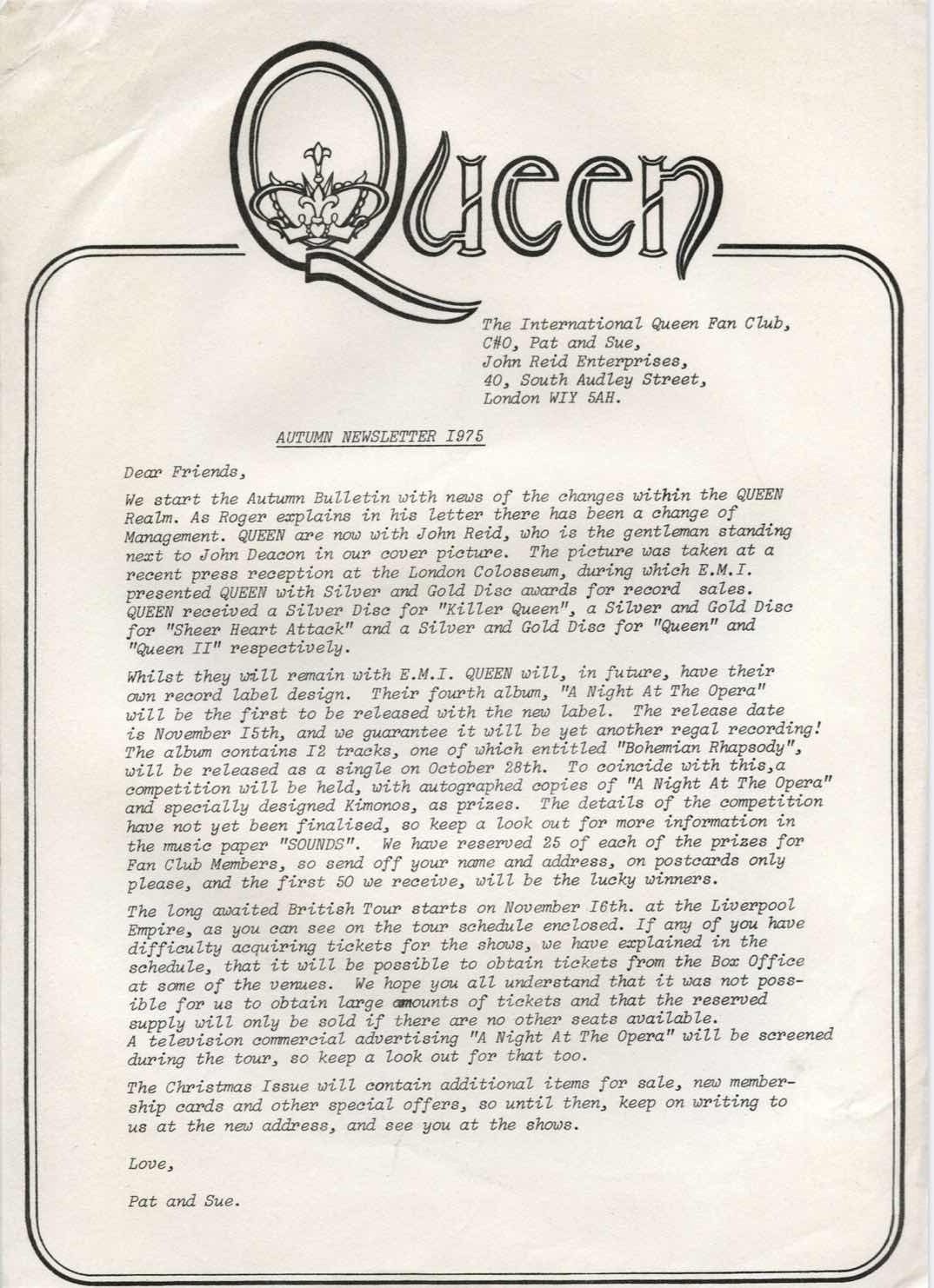 Queen 1975 Newsletter Roger Taylor Hand Written Letter about John Reid